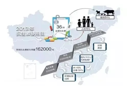 抗生素在人类和动物身上的滥用被认为是产生耐药性细菌的主要原因。在我国动物的饲养周期中,农民和农场主们一直向其投喂少量的药物,这些药物不是用于治愈患病动物,而是为了促生长,并抑制因近距离接触彼此的粪便而引发的疾病,动物吃下抗生素之后,只有很少一部分被吸收,大部分都会随粪便排出体外。