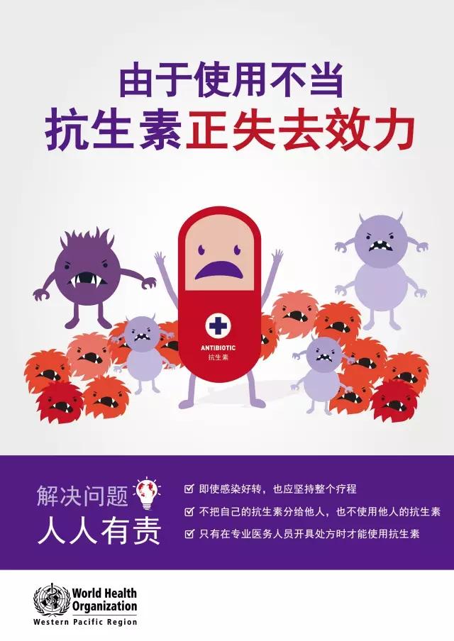 这是世界卫生组织在11月16-22日首个世界提高抗生素认识周发出的核心信息。世界提高抗生素认识周的主题是“慎重对待抗生素”,强调每个人可以为保护抗生素未来持续有效做些什么。